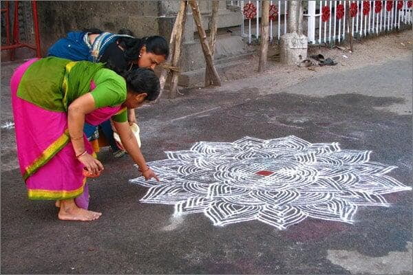 If you walk in the early morning along streets and alleys in the villages of South India, you will see women bent at the threshold of almost every home. In their hand will be a bowl of rice paste from which the women freehand geometric symbols in a clean unbroken line to sanctify and decorate their doorstep.